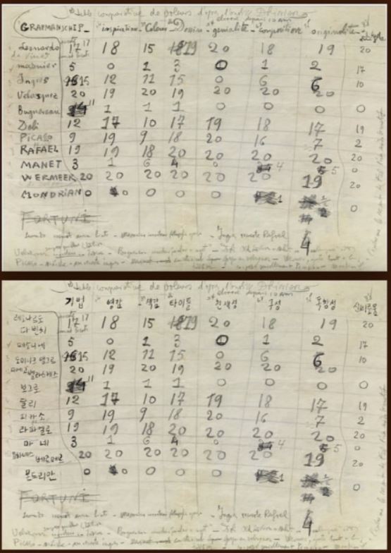 거장들에게 나름대로 평점을 내린 표를 보면 깊은 연구와 그들과 견주려는 뛰어넘으려는 치열한 노력이 있었을 것으로 짐작된다.