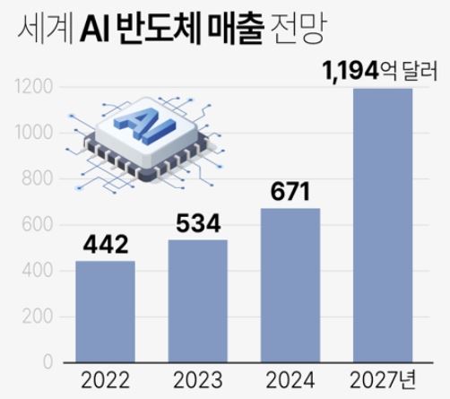 시장조사업체 가트너는 2023년 전 세계 AI 반도체 매출이 2022년(442억달러)보다 20.8% 증가한 534억달러(약 71조원)이 되고 2024년에는 23년보다 25.6% 증가한 671억 달러, 2027년에는 2023년의 두배가 넘는 1천194억달러에 달할 것으로 전망했다.
