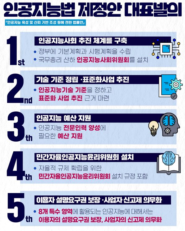 2023년 2월 국회 과학기술방송정보통신위원회에서 AI 기본법이라 할 수 있는 「인공지능 산업 육성 및 신뢰 기반 조성에 관한 법률안」을 합의했으나 상임위에서 멈춰있다.