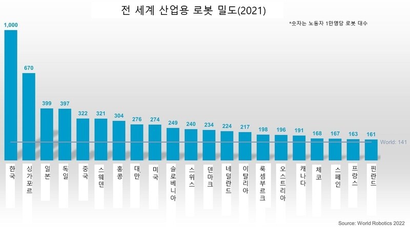 우리나라의 산업용 로봇 밀도(인구 만 명당 로봇 대 수)는 2021년 기준 세계 1위다. 전자산업과 자동차산업에 주로 쓰이고 있다. 이는 경제에 비용 절감과 고용 감소라는 양날의 검이 된다. 로봇 생산량 세계 1위는 2021년 기준 일본으로 산업용 로봇의 45%를 공급했다.