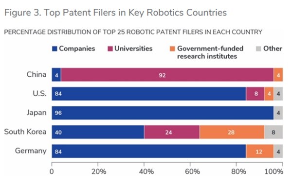 중국은 로봇 특허 출원 수가 미국의 3배일 정도로 명실상부한 세계 1위다. 우리나라의 경우 대학과 정부기금 비중이 높은데 로봇 연구에 힘쓰는 젊은 청년과 교수진이 있다는 반가운 소식이고, 국가 주도와 보조로 연구가 많이 이루어진다는 뜻이다. 인재가 이공계를 기피하고 의대로만 몰리는 추세라 향후에는 어떨지 걱정된다.